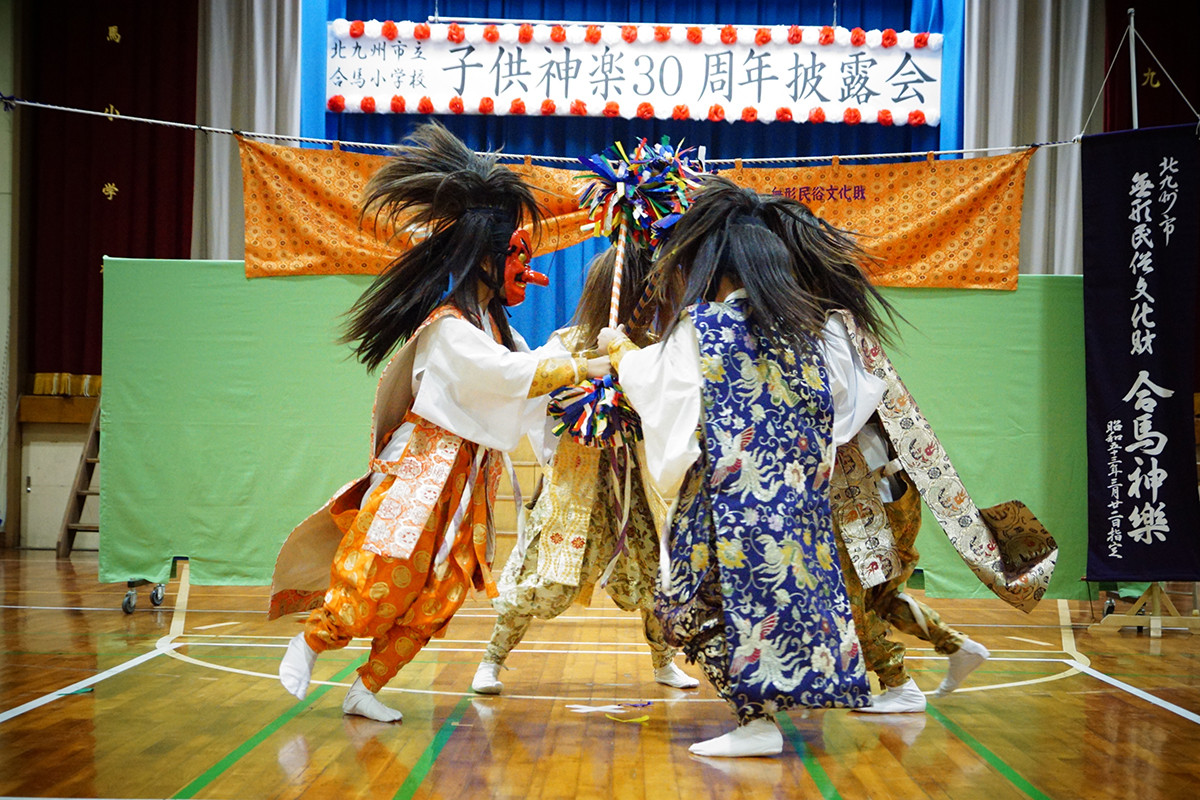 北九州市立合馬小学校は、30年にわたり、農業体験や地域に伝わる伝統文化、地域の特産物を利用した活動を各学年の教育課程に取り入れて、自分や周りの人、そして合馬の地域を愛する子どもを育てています。農業体験学習は当初の地域主体の活動から、児童の願いを実現する活動に発展し、収穫したコメの販売によって餅米を購入し餅つきを行ったり、縦割り活動でサツマイモの苗植えを行ったりしています。また、合馬地区に伝わる神楽を保存会の指導の下、「合馬子ども神楽」として学校で行い、1年生から6年生までがそれぞれ分担して取り組んでいます。披露会では6年生の舞、衣装をつけた3・4・5年生の楽によって保護者や地域に向けた披露が行われています。