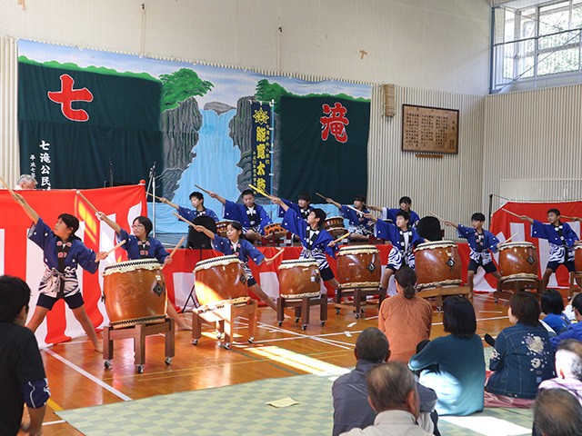七滝公民館祭で5年生が能寛太鼓を披露している様子