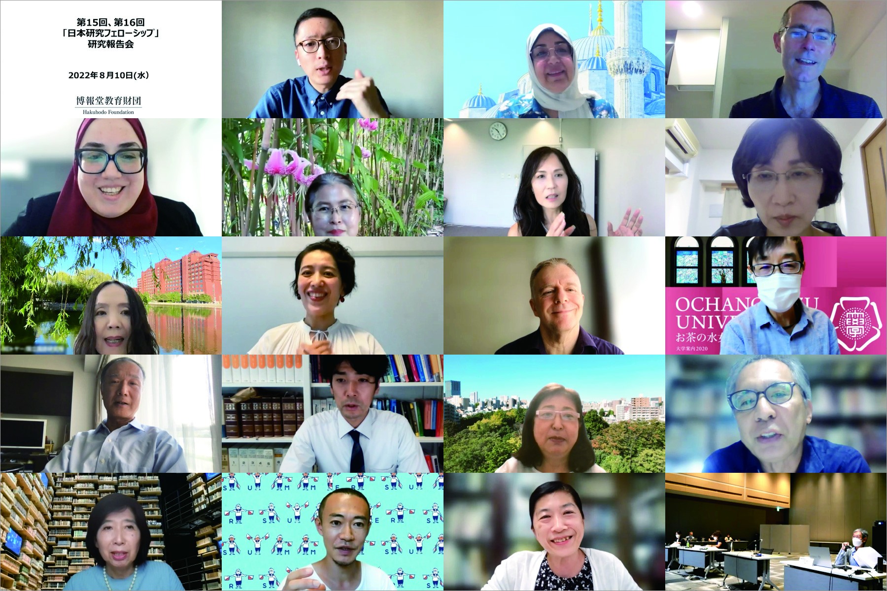 8月10日(水)、第15回、第16回、「日本研究フェローシップ」研究報告会を開催しました。当初、対面形式での報告会を計画し準備を進めていましたが、折悪しく新型コロナウイルス第7波が拡大。安全を優先し、直前になってオンラインでの報告会に変更しました。招聘研究者10名、受け入れ担当教員・窓口担当者12名、審査委員の先生方6名、および財団関係者を含めて40名余りが参加し、途中に休憩をはさみながら、7時間にわたって研究報告・質疑応答、審査委員による講評等が行われました。